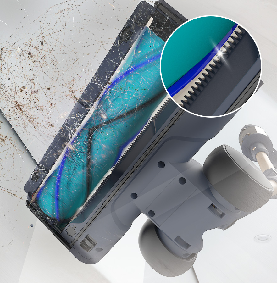 Su cepillo HairLess XL cubre más área en cada pasada y atrapa los pelos. Su diseño en forma de "V" elimina los pelos y reduce la limpieza manual del cepillo. Además, el diseño dentado del interior del pie de aspiración HairOut, permite cortar los pelos enredados, evitando atascos y manteniendo el cepillo limpio por más tiempo.