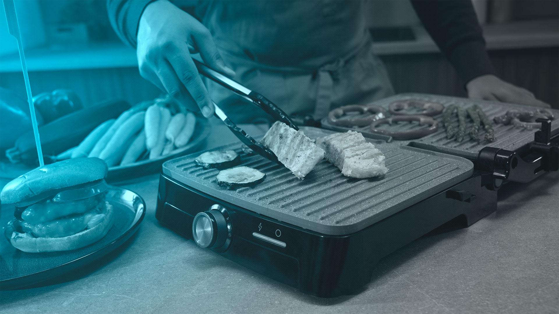 La placa superior flotante se adapta en altura a cualquier alimento para conseguir resultados perfectos sin que importe su grosor y sin aplastar la comida.
