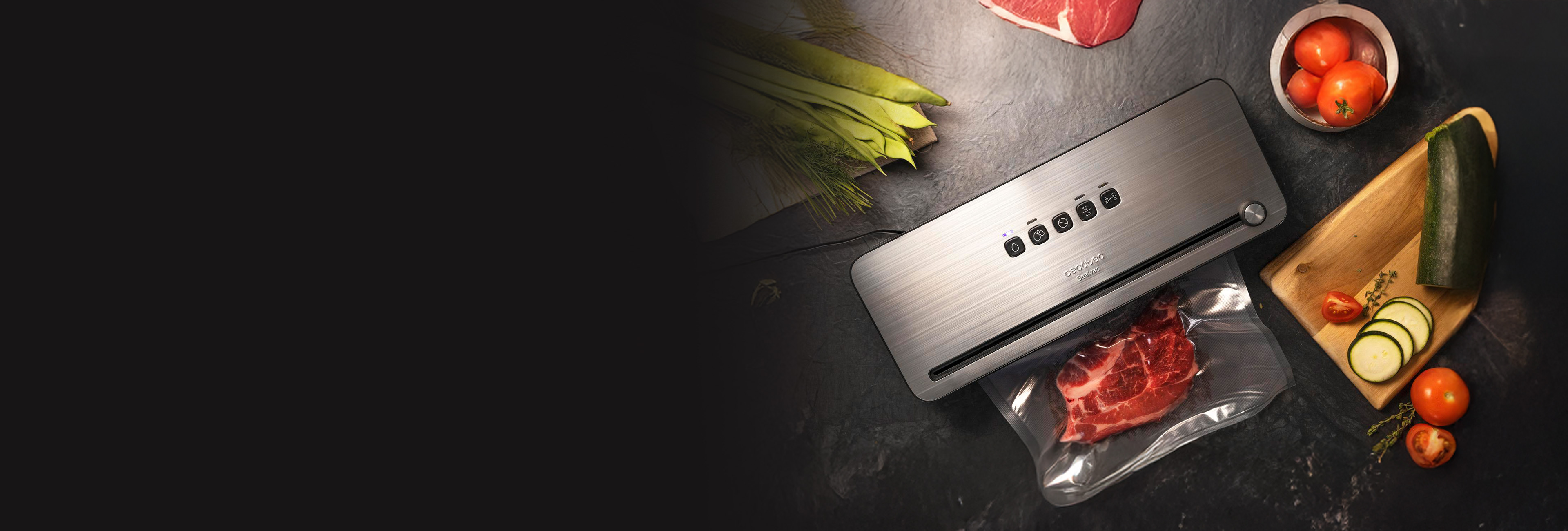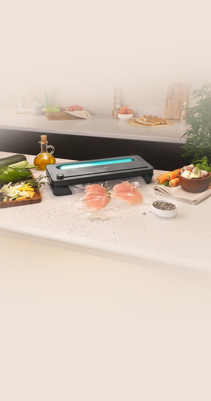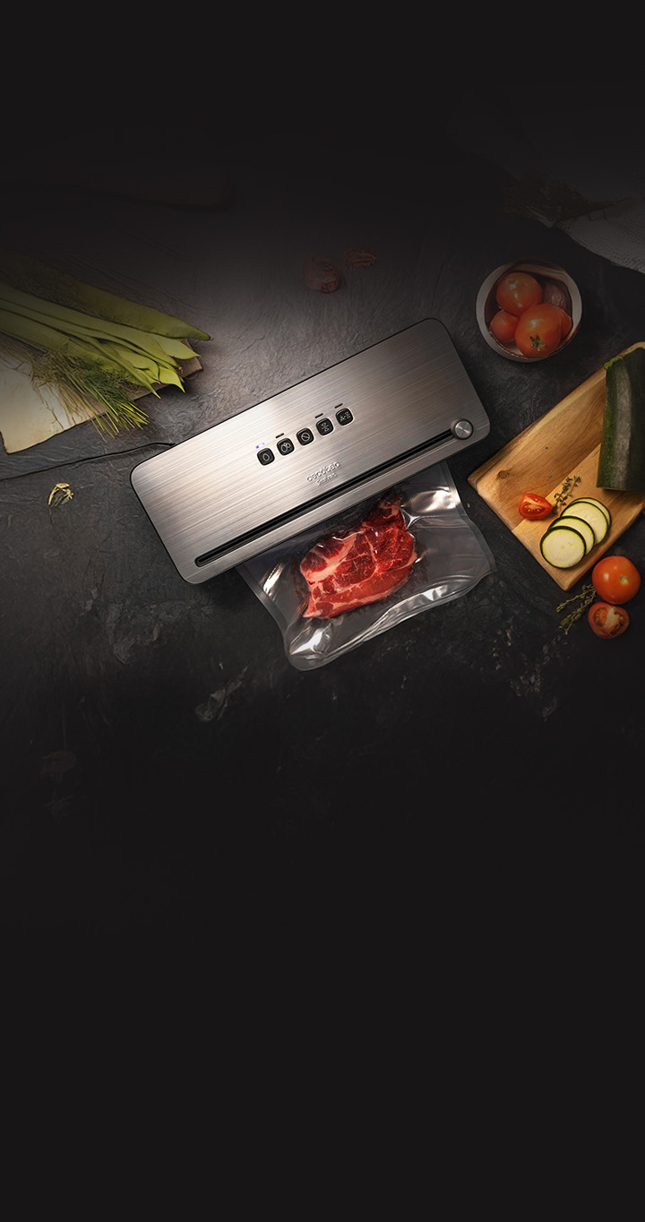 Permite un vacío total y un sellado automático de tus alimentos. Además, incluye la función de sellado independiente para envasar líquidos.