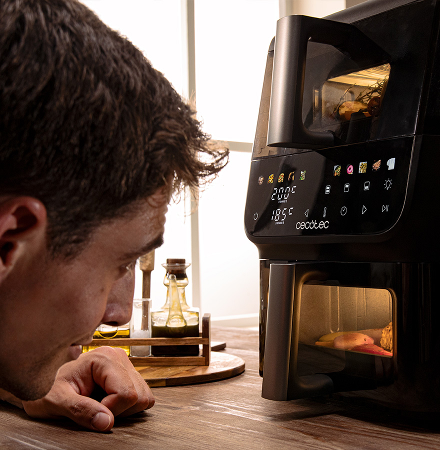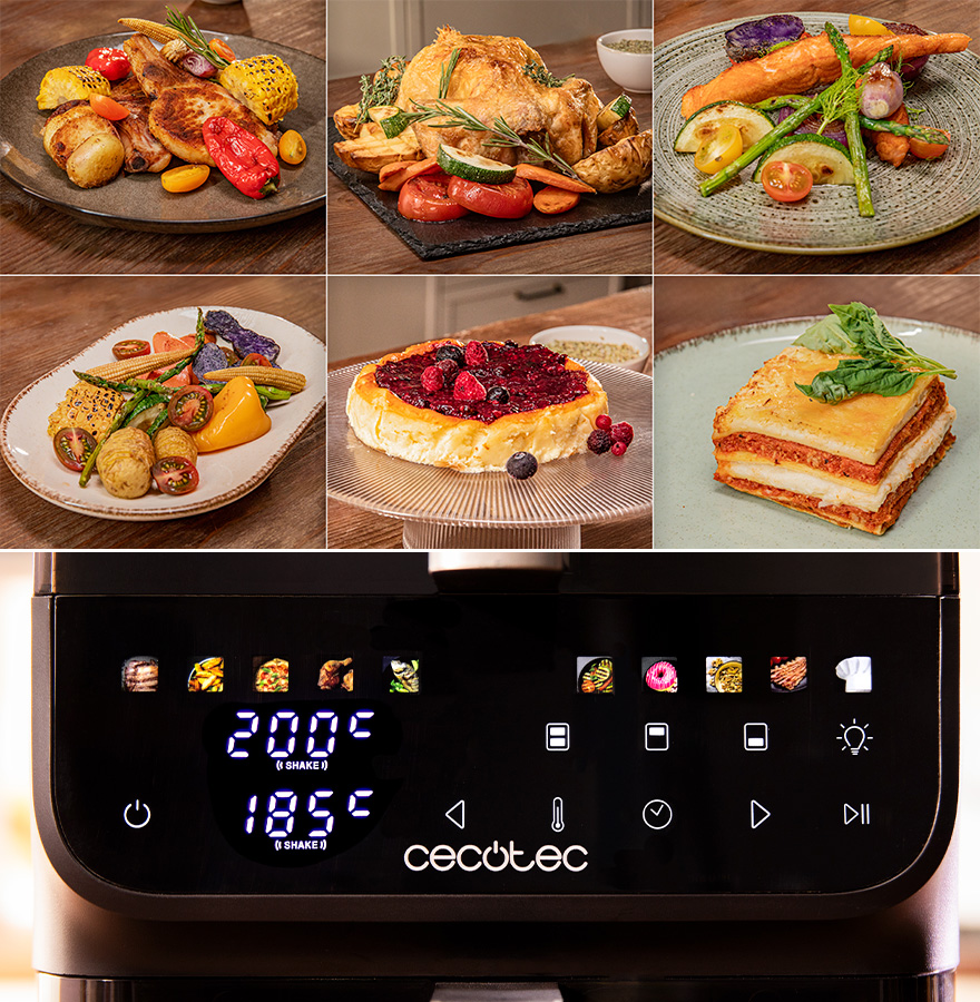 Con su panel táctil multifunción a color y 10 menús, cocina fácil y sin complicaciones. Elige entre sus 10 menús, y ella sola ajustará automáticamente el tiempo y la temperatura para obtener el punto ideal. Modos: carne, patatas fritas, pizza, pollo, pescado, verduras, repostería, deshidratar, fermentar y a tu medida.