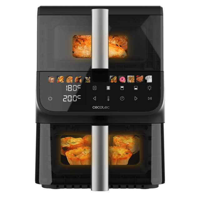 Equipada con 2 cubetas superpuestas de 3,5 L y 6,5 L, te permite cocinar dos platos a la vez ocupando hasta un 44% menos de espacio* en la encimera. Su diseño vertical permite colocarla incluso bajo el mueble de cocina.*Comparado con el modelo Cecofry&Grill DuoHeat 10000