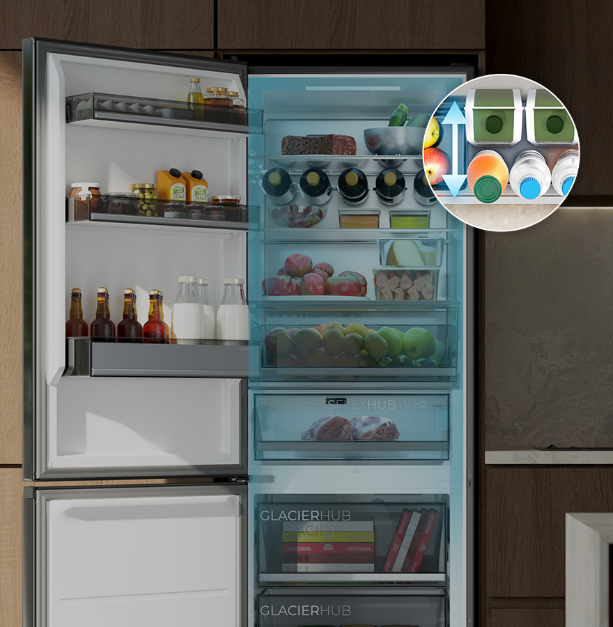 Su diseño más profundo permite almacenar botellas grandes e incluso dos filas de botes, permitiendo guardar mayor cantidad sin perder eficacia de enfriamiento.