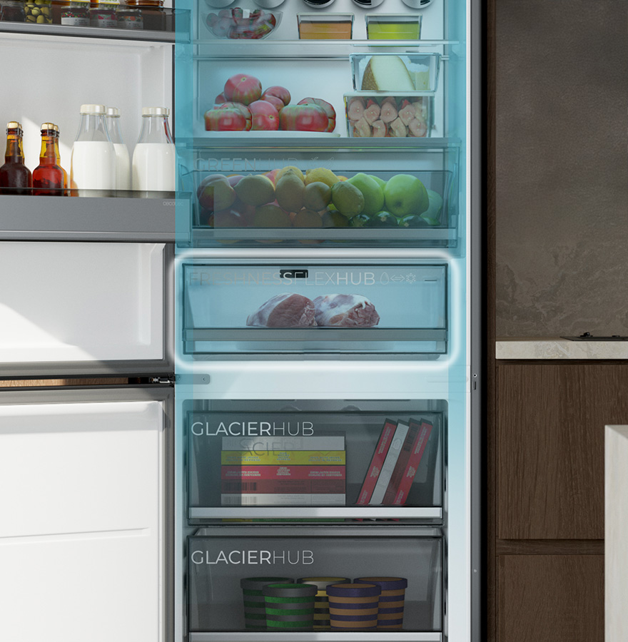 Regula la temperatura y humedad del cajón Freshness Flex Hub para alargar la frescura original de tus alimentos.