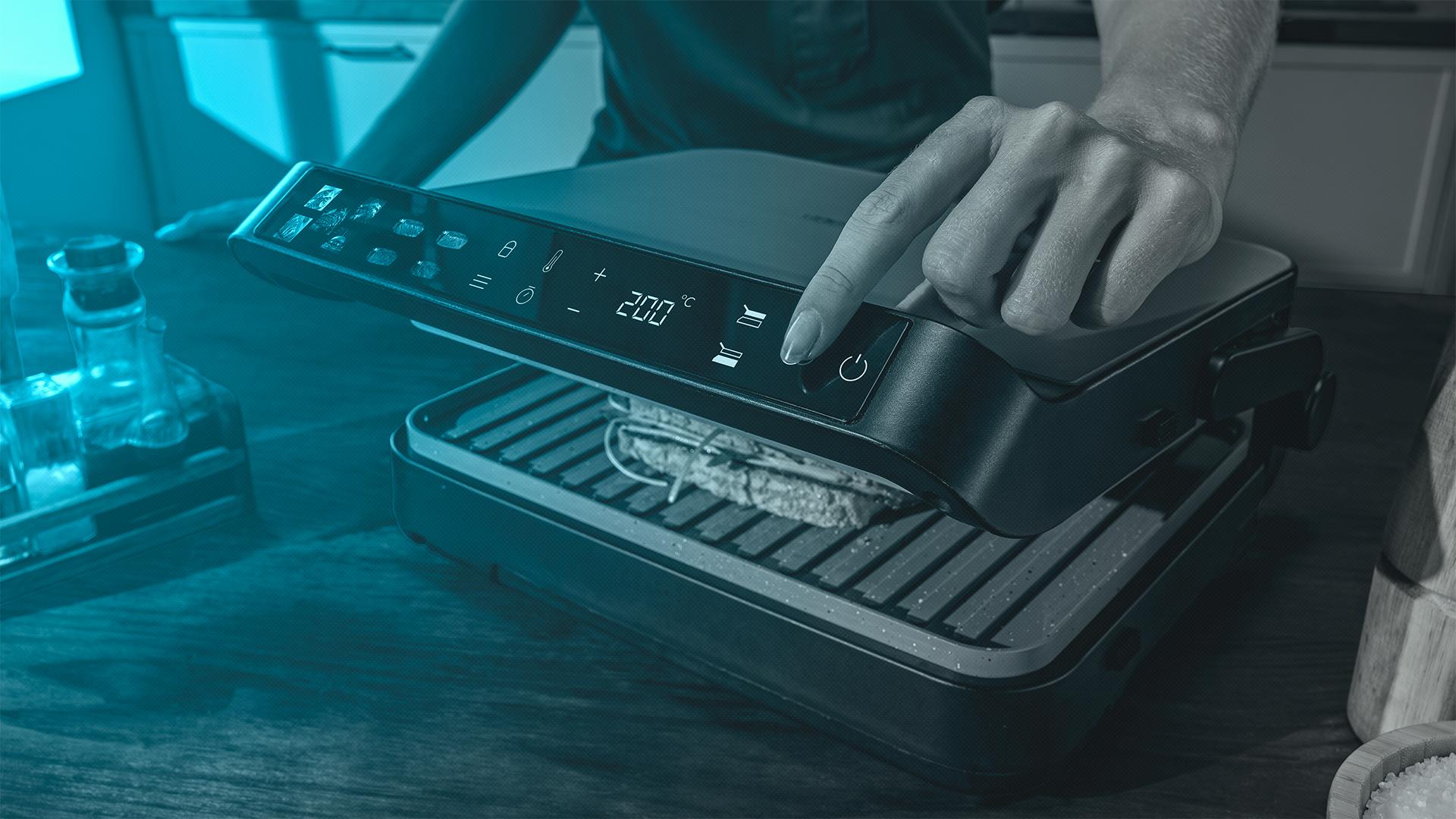 Control táctil avanzado integrado en el asa. Pantalla LED de color que permite configurar parrilla, temperatura y cocción de manera cómoda e intuitiva.