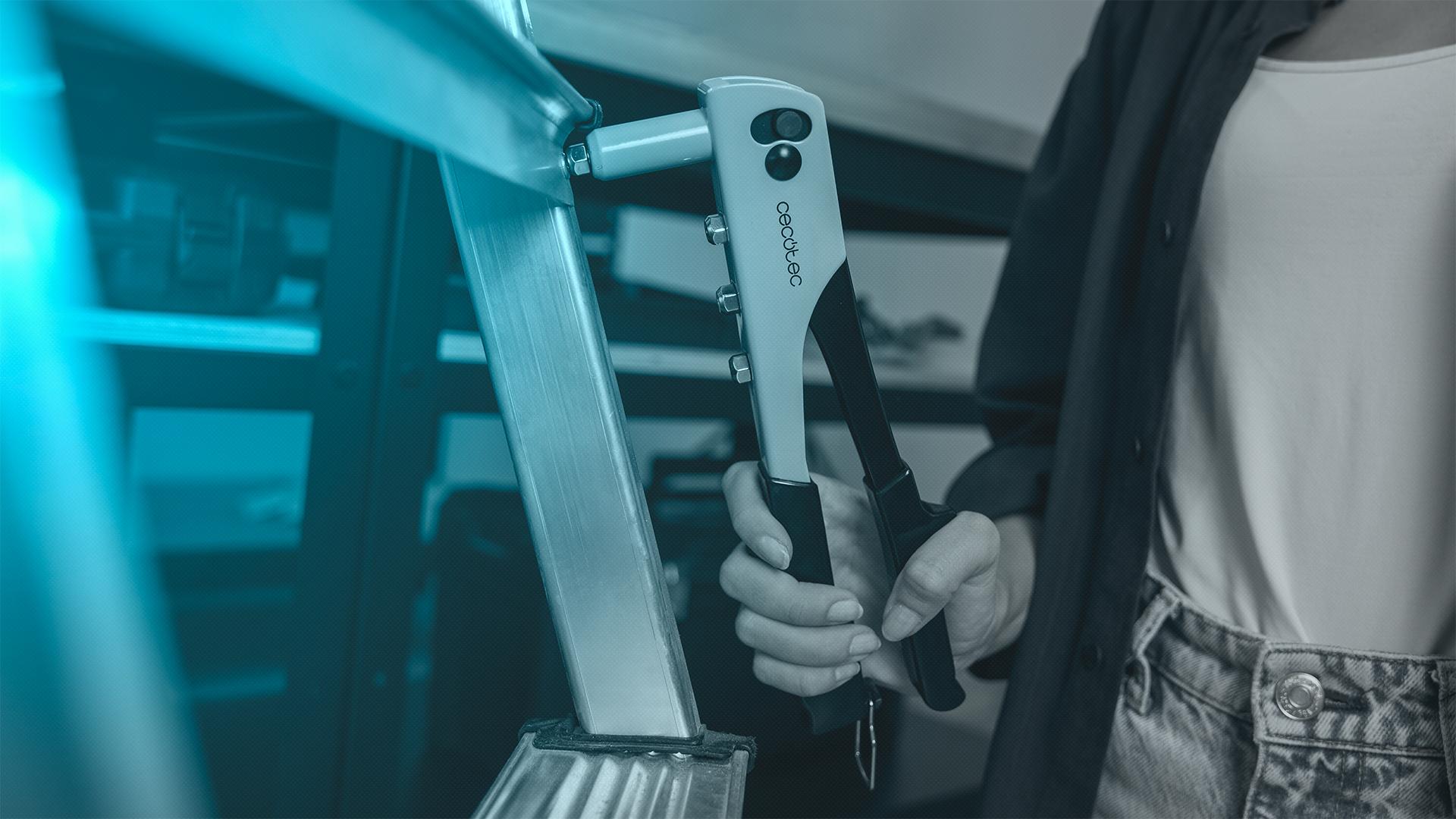 Remachadora manual con llave de ajuste y kit completo de 4 boquillas, 400 remaches y 4 brocas para que puedas empezar a trabajar desde el primer momento. Además, incluye un maletín para que puedas llevarla contigo a donde quieras.