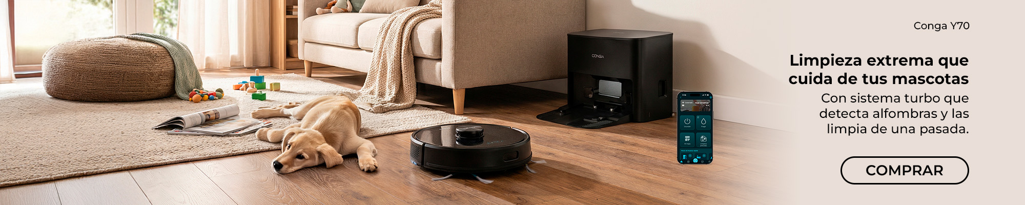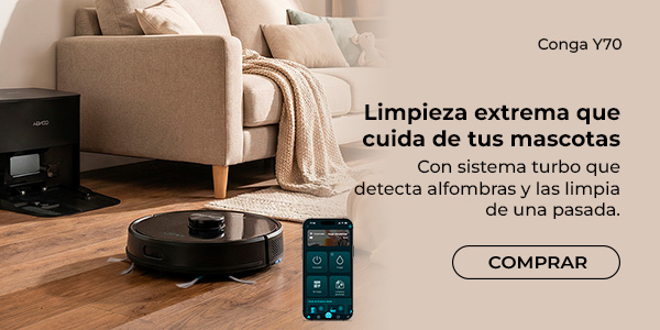 Conga Y70 Robot aspirador con Navegación láser APP y Wifi. 20000 Pa de presión de succión, 180m2 de autonomía. Cepillo de silicona especial para casas con mascotas. Base de autovaciado con bolsa de polvo de 3 L.