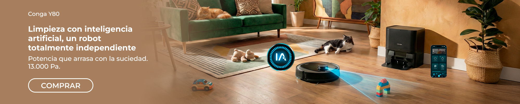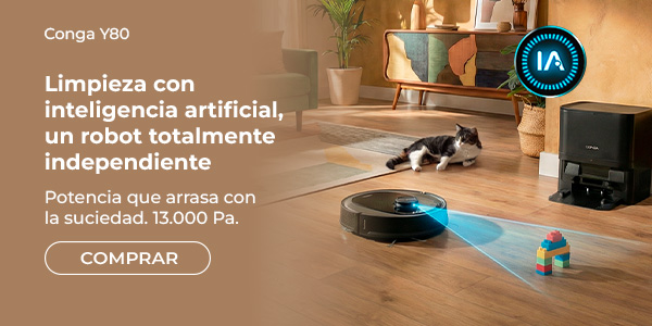Conga Y80 Robot aspirador con IA Laser Eye y navegación láser inteligente. Aspira, barre, friega y pasa la mopa con 13000 Pa y cepillo antienredos. Autonomía hasta 220 m², base de vaciado automático 2,5 L y APP 3.0 para limpieza por zonas.