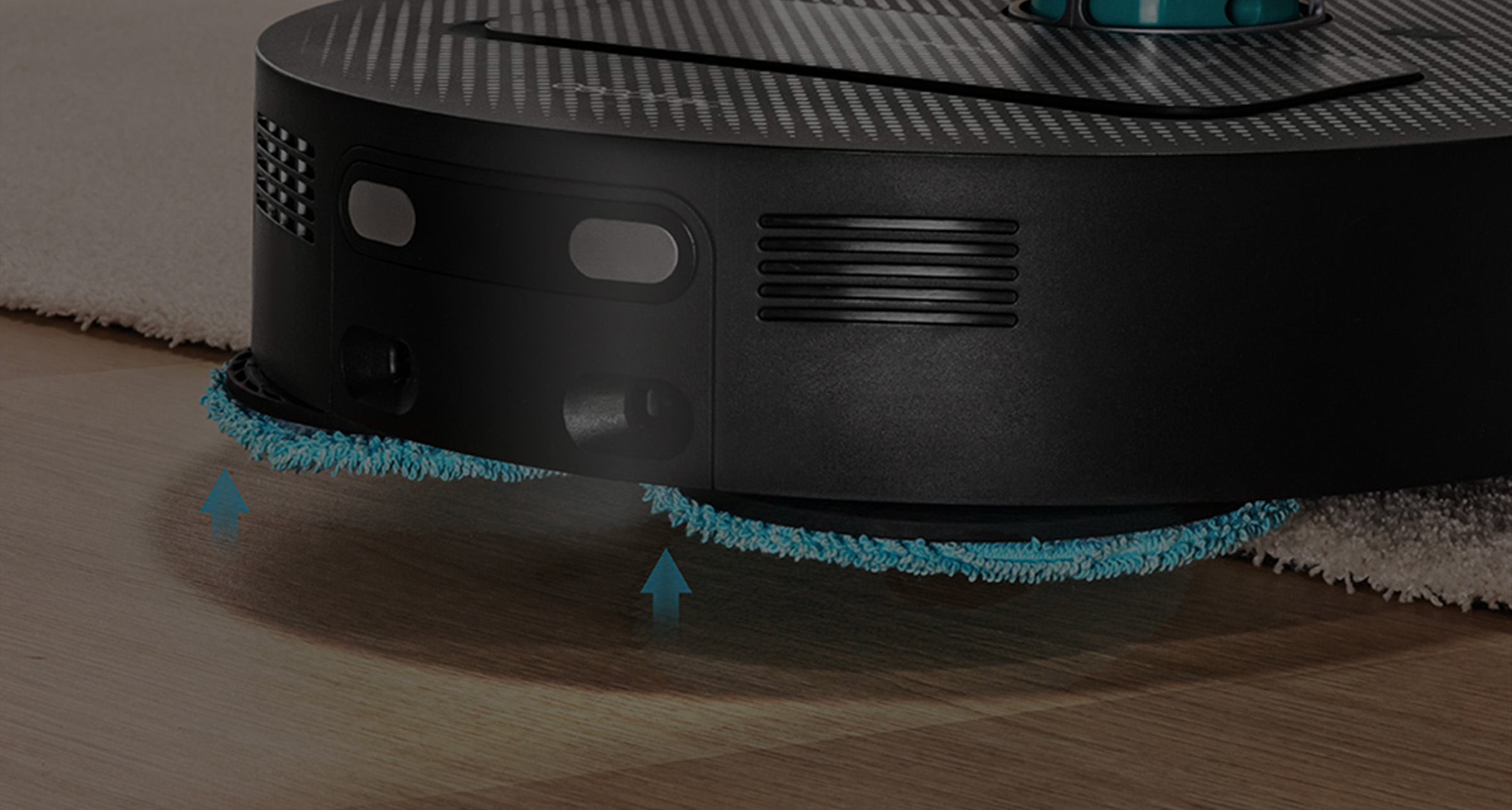 Cuida y limpia tus alfombras en profundidad. Gracias a sus sensores de detección ultrasónica eleva las mopas para protegerlas de la humedad y centrarse en aspirar a máxima potencia.