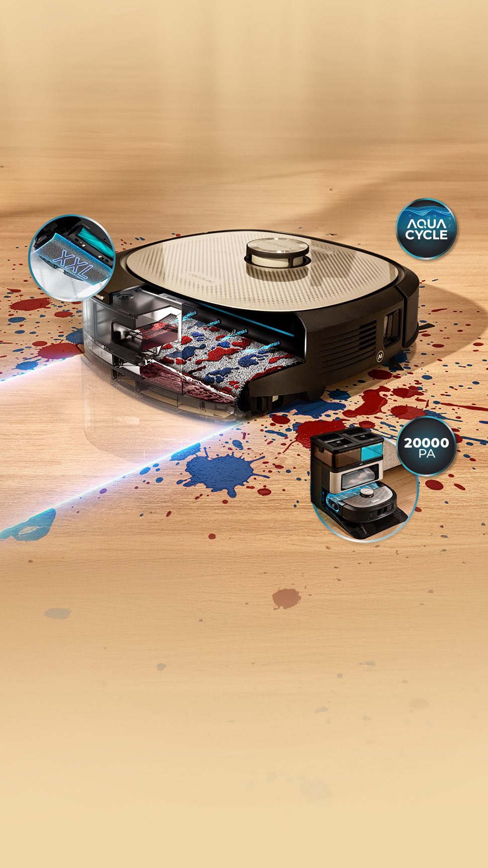 Conga Z100 X-Treme Robot aspirador especialista en fregado con tecnología AI LaserEye. Fregado profesional con su mopa bimaterial XXL. Base total de autovaciado de polvo, de agua y limpieza de las mopas. 20000 Pa de presión de succión. APP y vinculación con Bluetooth y redes 2,4 y 5 Ghz.