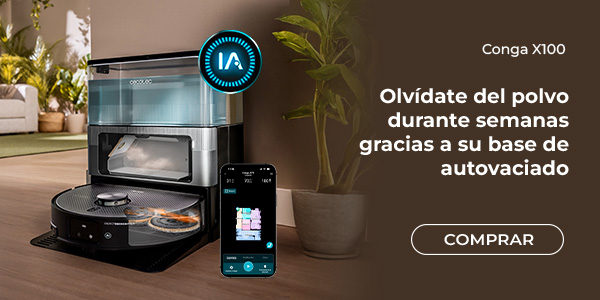 Conga X100 Robot aspirador con sistema de limpieza adaptativa. 20000 Pa de poder de succión, base 4 en 1 con desinfección. Inteligencia Artificial con cámara. Mopas giratorias elevables. Cepillo lateral y mopa extensible. App con video manager.