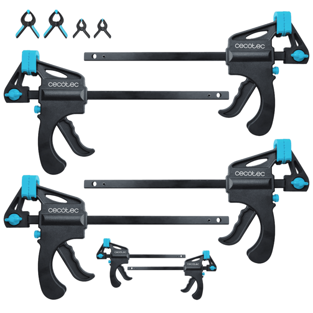• Kit completo. Set de 10 piezas con sargentos rápidos de presión y pinzas de presión.