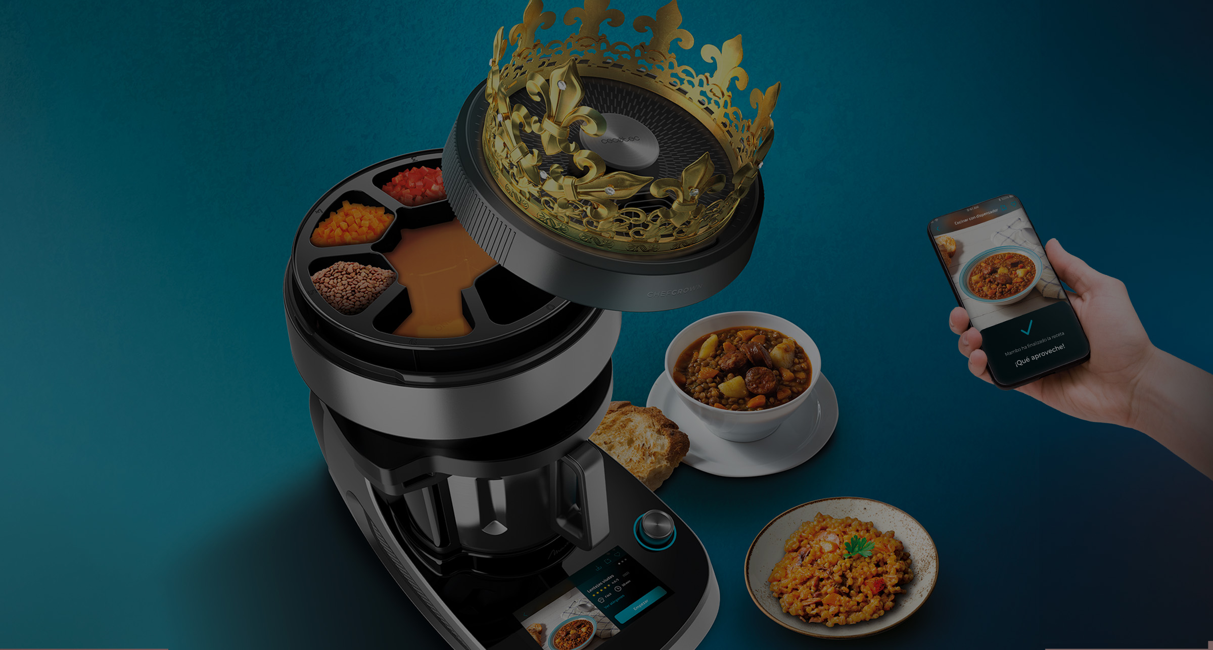 Añade los ingredientes en sus 6 compartimentos, el caldo a su cubeta central ¡y listo! Olvídate de todo, ChefCrown dosificará cada alimento en el momento ideal para conseguir recetas perfectas.